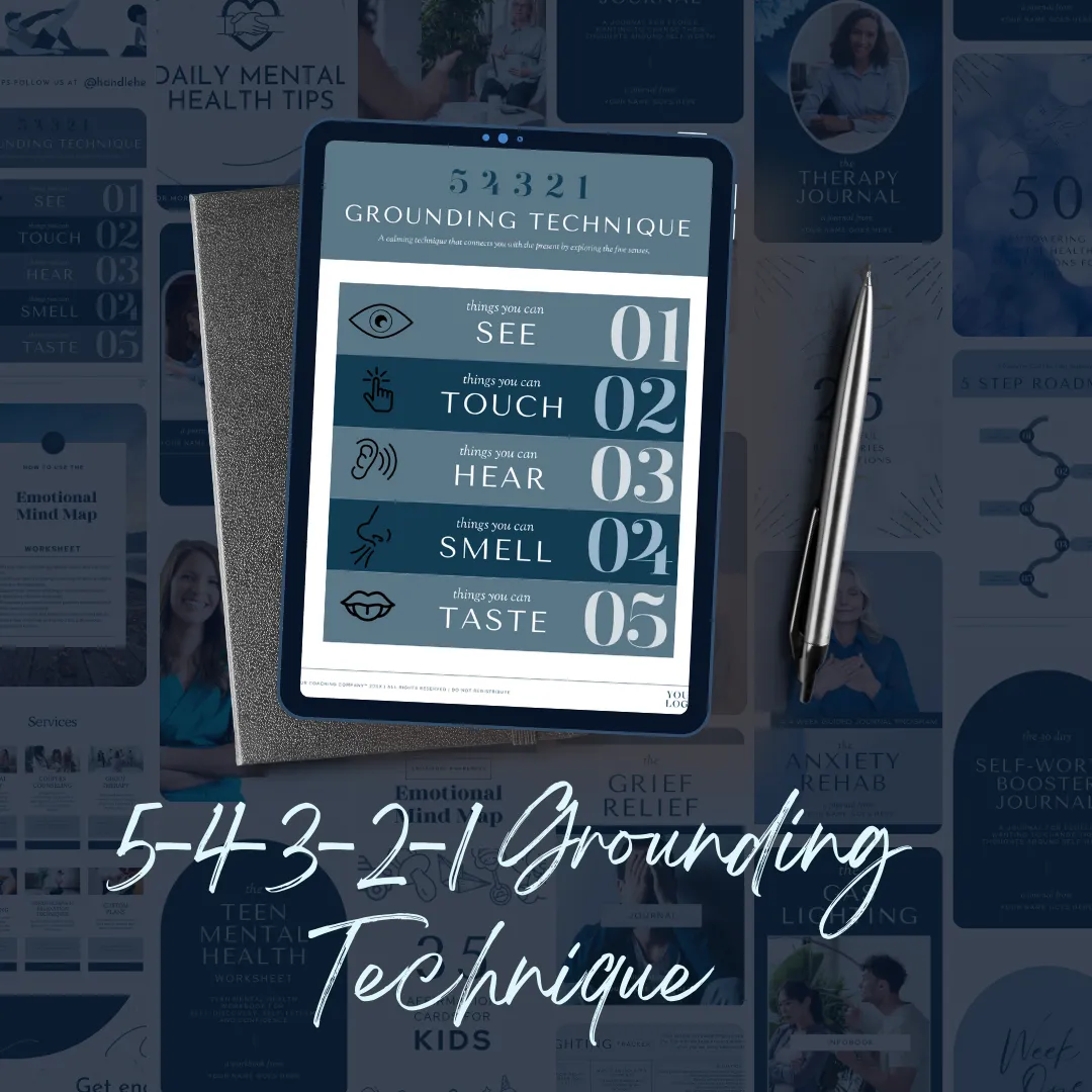 A visual aid for coaches to teach clients the 5-4-3-2-1 grounding technique, aiding in anxiety reduction and emotional regulation for immediate relief during coaching sessions.